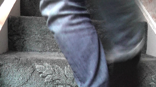 The shot afterwards then includes a slight low angle shot of me placing the cable and connecting it in the microphone. Then going back upstairs with a close up shot of my feet going upstairs with the camera placed on the stairs.